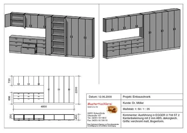 Von der Nachbestellung eines Einlegeboden bis hin zur kompletten Einrichtung von Objekten sind wir Dein Partner. Gern zeichnen wir für Deine Kunden eine perspektivische Darstellung mit Deinem Firmenlogo, die Du Deinem Angebot beilegen kannst. Dieser Service ist für Dich natürlich kostenlos und unverbindlich.